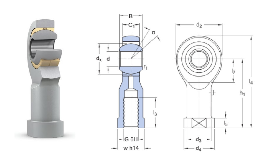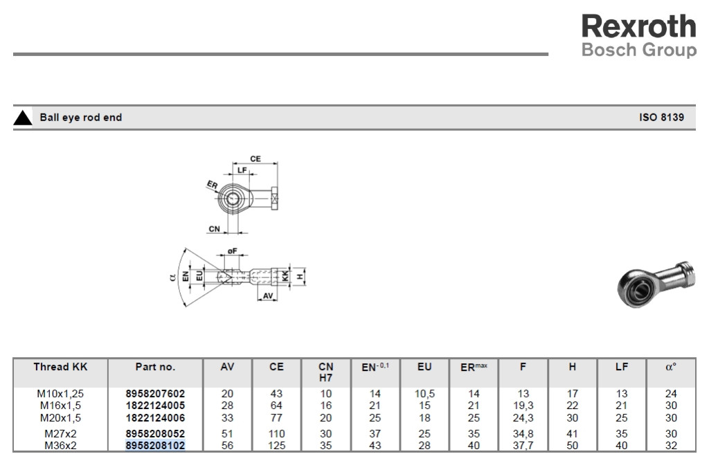 1822124013, 8958208052, CM2-AP6-M27X2, Rexroth / Aventics Rod End, Gondozásmentes rúdvég, gömbcsukló, M27x2 belső jobbmenetes gömbszem, szemes rúdvég, 30 mm-es furattal, csúszóréteg: PTFE-bronz