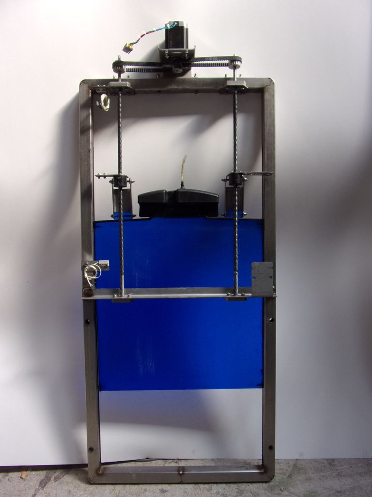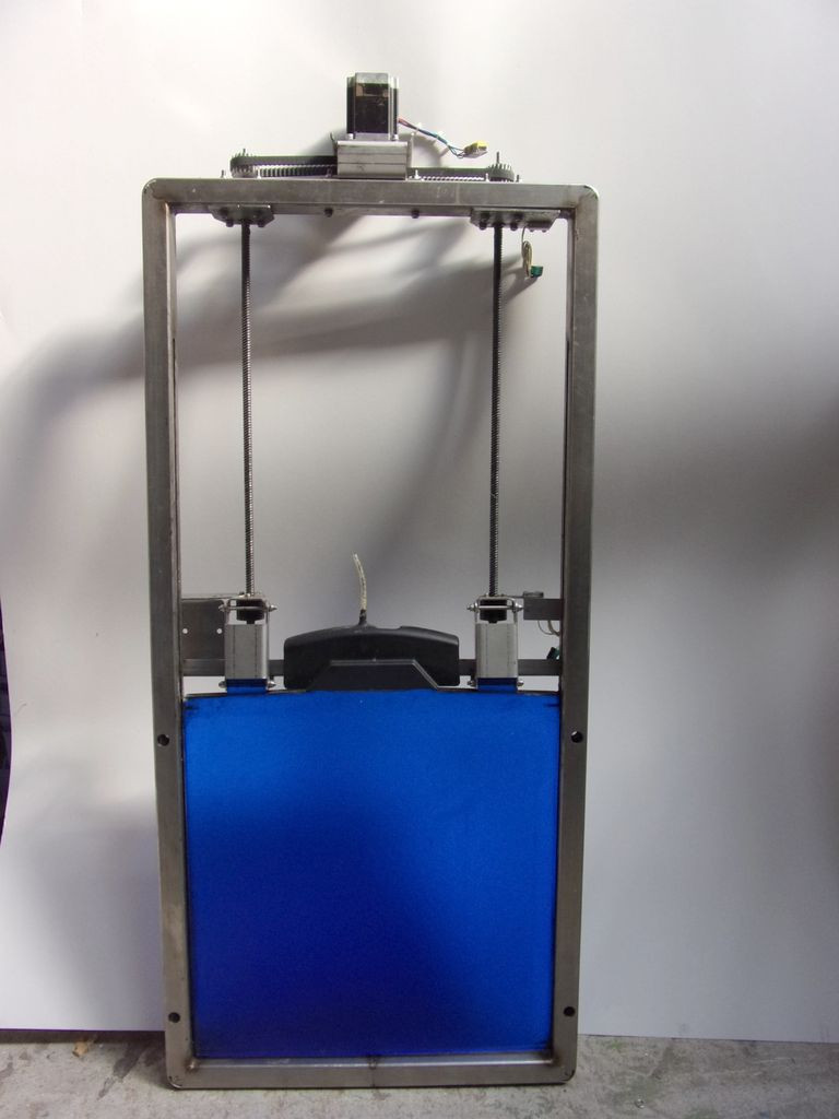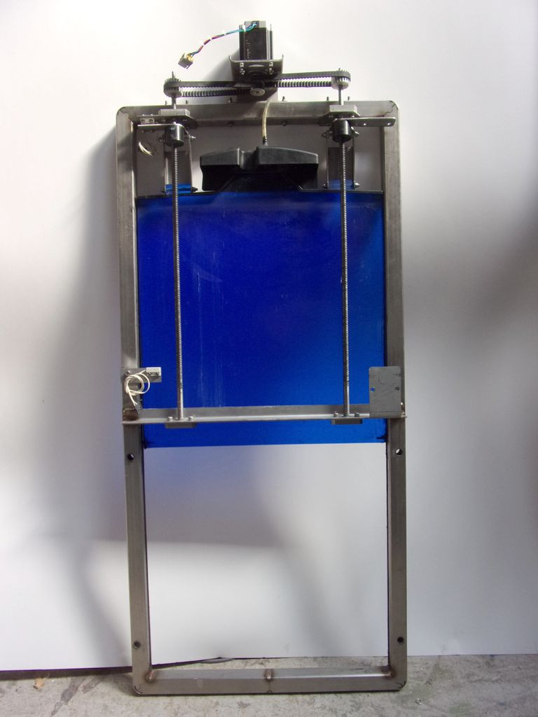 Leírás: Elzáró, elválasztó modul, mozgó plexilappal. 2 Menetes orsó által mozgatott, motorral együtt. Két menetes orsóval, fogasszíj hajtással. Két végállásszenzor is van rajta, a két végállásnál.