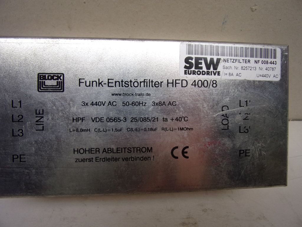 Block / SEW HFD 400/8, NF 008-443, 8257213, 3 fázisú hálózati zavarszűrő, vonalszűrő, RFI szűrő, EMC/RFI, EMI filter, 3x440VAC 50-60Hz, 3x8A