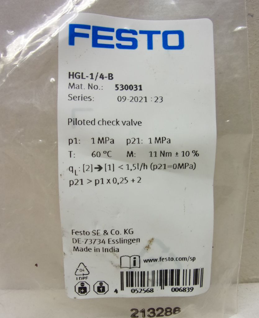 Festo HGL-1/4-B, 530031 vezérelt visszacsapószelep, G1/4" csatlakozás, 0.5 - 10 bar, 550 l/min