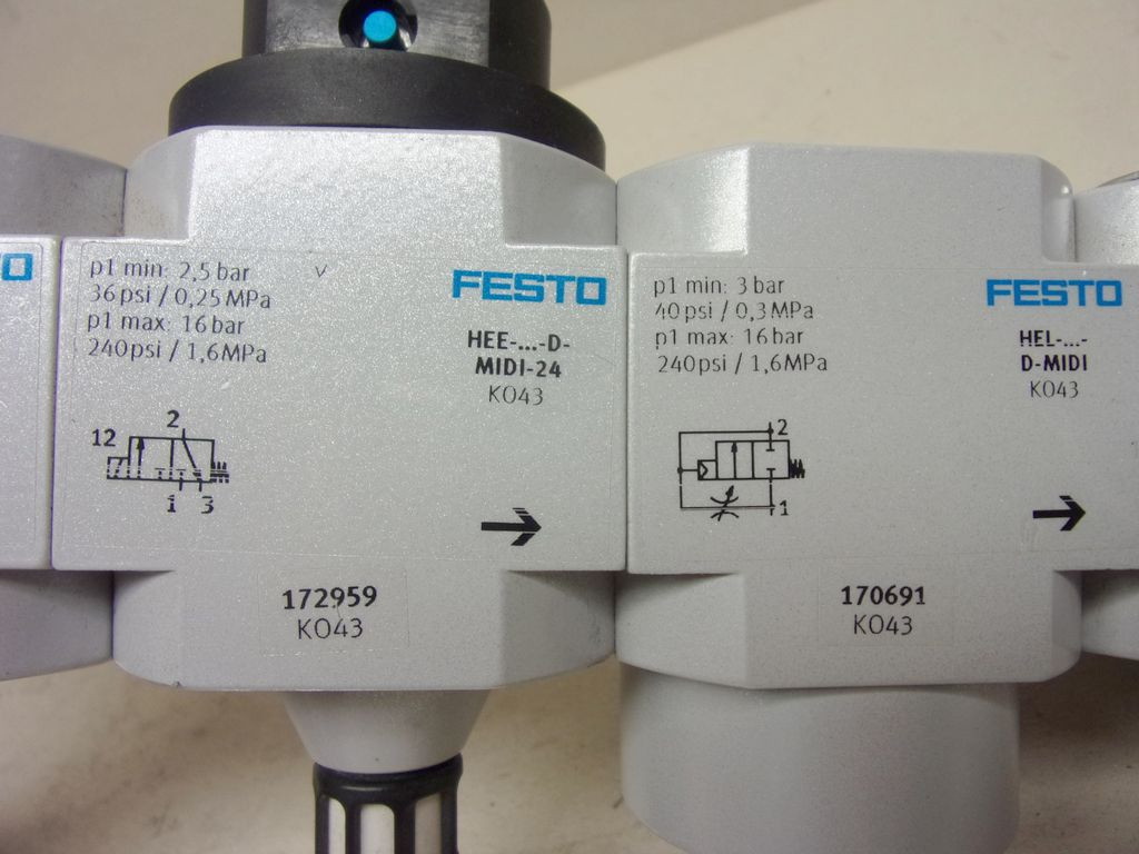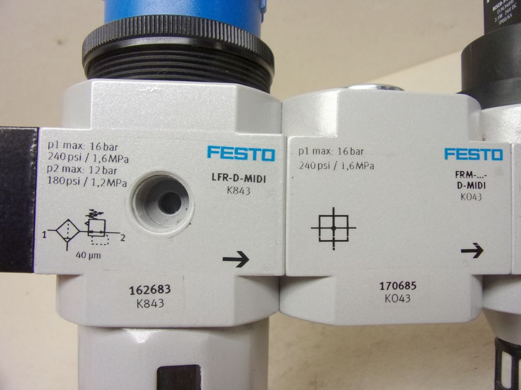 Festo Pneumatikus levegőelőkészítő egység 5 modullal, 162683 LFR-3/4-D-MIDI, Szűrő-nyomásszabályozó szelep, 2x 170685 FRM-D-MIDI Leágazó modul + 172959, HEE-D-MIDI-24 ki, és Bekapcsoló szelep + 170691, HEL-D-MIDI Bekapcsoló szelep 3/4" BM