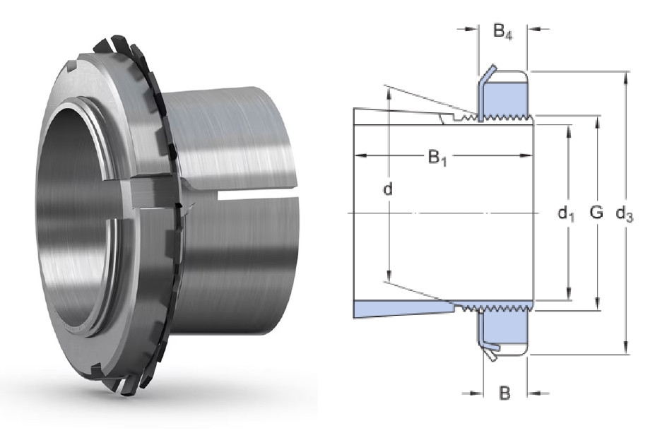 Leírás: Adapterhüvely kupos tengelyfuratú csapágyakhoz, feszítőhüvely KM hornyos anyával és MB biztosító alátéttel, metrikus méret, Kúp= 1:12