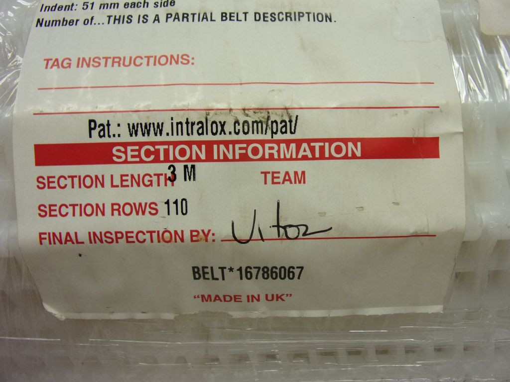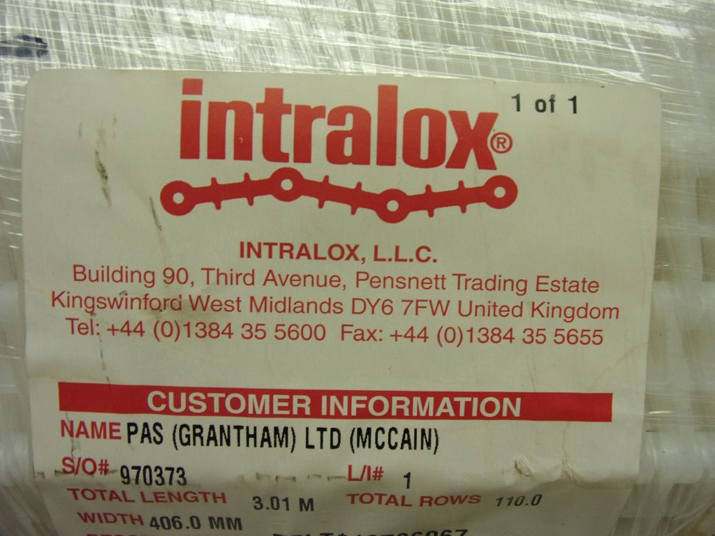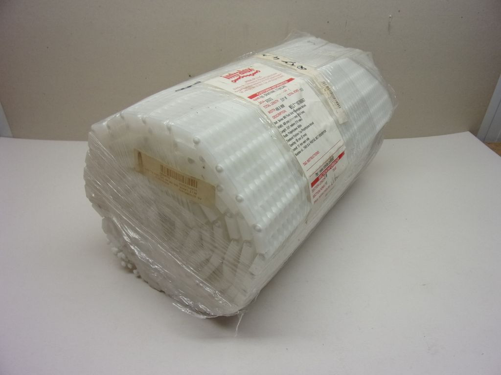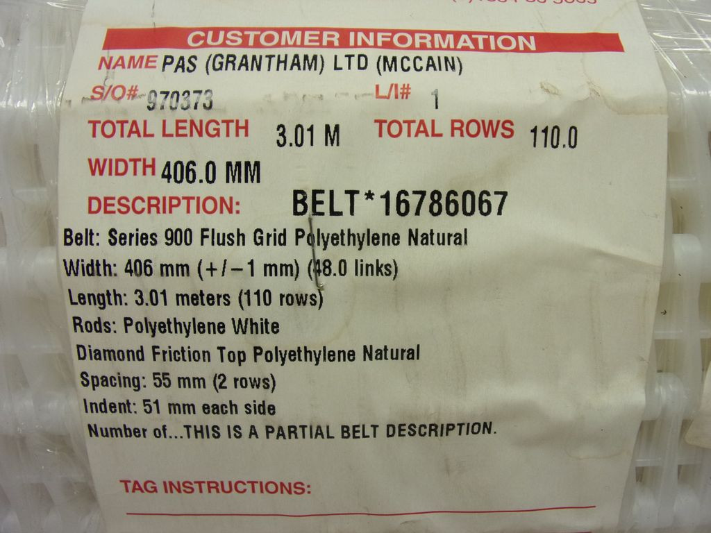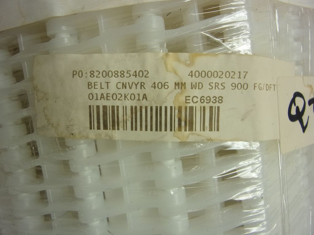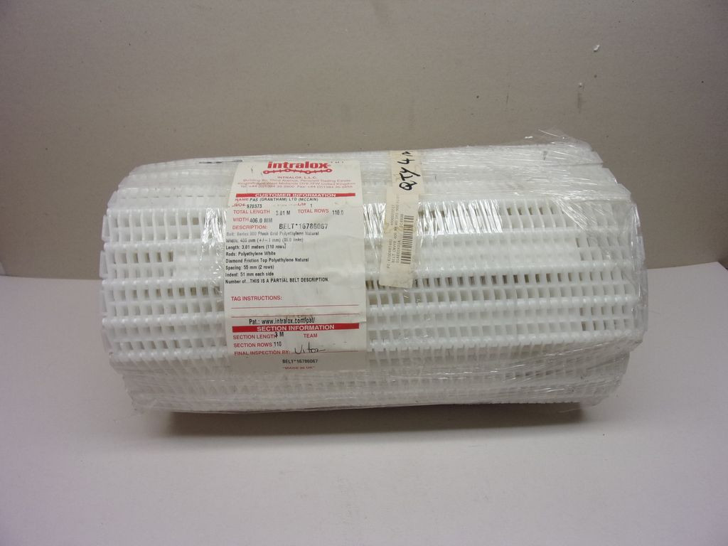 Intralox Series 900 modulszalag, S900 modul rendszerű élelmiszeripari szállítószalag, műanyag futószalag, fehér Polietilén, 406 mm széles, 3,01 m hosszú, flush grid felület, +20db. illesztőtüskével,