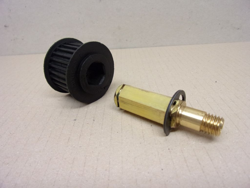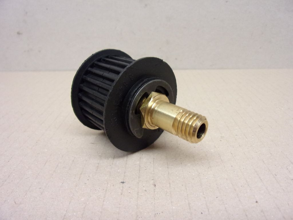 Leírás: Műanyag fogasszíjkerék, réz tengelyen, egyik végén menettel, egy seeger-gyűrűvel.