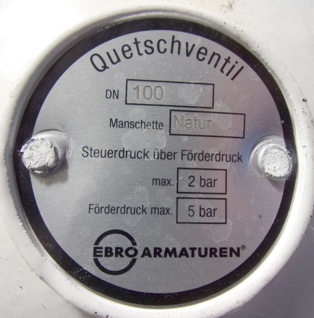 Ebro Armaturen DN100 Natur, EBRO Pneumatikus QV szorítószelep DN100, Szelep 2-5 bar, 100mm (4") belső, 220mm karimakülső, 280mm hossz, 1/4" KM, szennyvizet, iszapot és hasonló közeget tartalmazó szilárd anyagokhoz