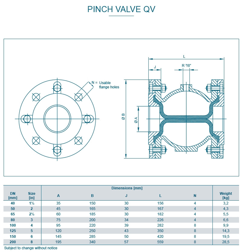 Adatok: QV szorítószelep Teljes furatú szorítószelep szennyvizet, iszapot és hasonló közeget tartalmazó szilárd anyagokhoz. Teljes áteresztés, különösen alkalmas iszaphoz, porhoz granulátumhoz. Mágnesszelep rászerelése elektro pneumatikus működtetést tesz lehetővé. Tetszőleges beépítési helyzet.