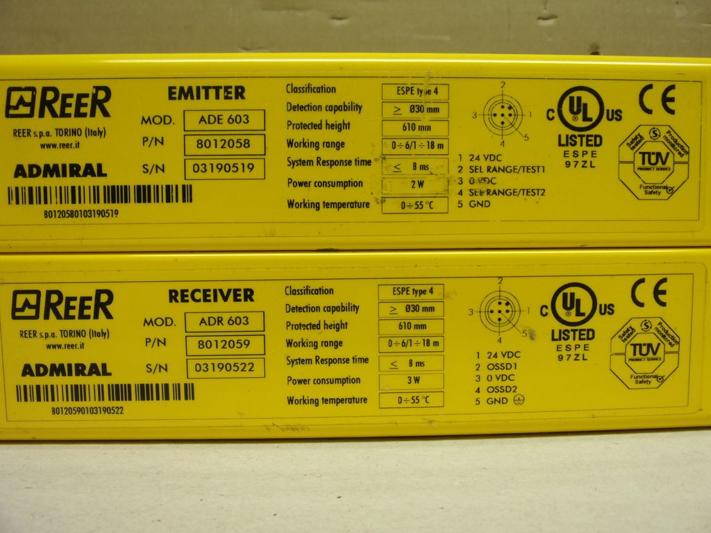 REER Admiral ADE 603 8012058 + ADR 603 8012059, Biztonsági fényfüggöny adó-vevő pár, fénysorompó, fénykapu, 610 mm védőmező, 30 mm-es felbontás, 18 m hatótáv, 4-es biztonsági szint, Tipo 4, SILCL 3, PL e, Cat. 4