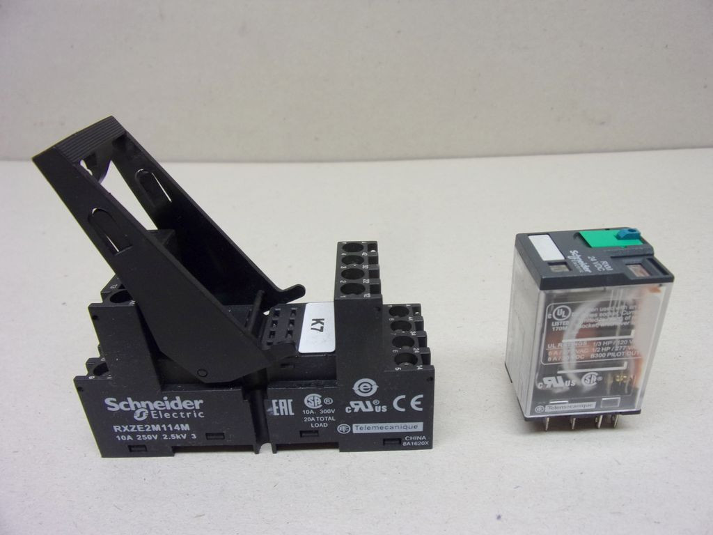 Schneider Electric RXZE2M114M Zelio foglalat, RXM2 és RXM4 relékhez + RXM4AB2BD Zelio RXM miniatűr relé, 4CO, 6A, 24VDC, tesztgomb, LED, DIN sínre szerelhető relé foglalattal, sorkapocs relé