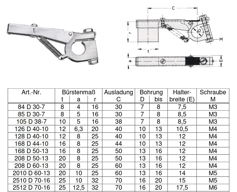 2010D70-16, 2010DE70B16, Ipari bronzkefe vagy szénkefe tartó 10x20 mm-es kefékhez, áramszedő, sorolható rugós feszítő, 16mm tengelyre, 15 m/s kerületi sebességig, dinamókhoz, generátorokhoz, villanymotorokhoz, darukhoz, stb.