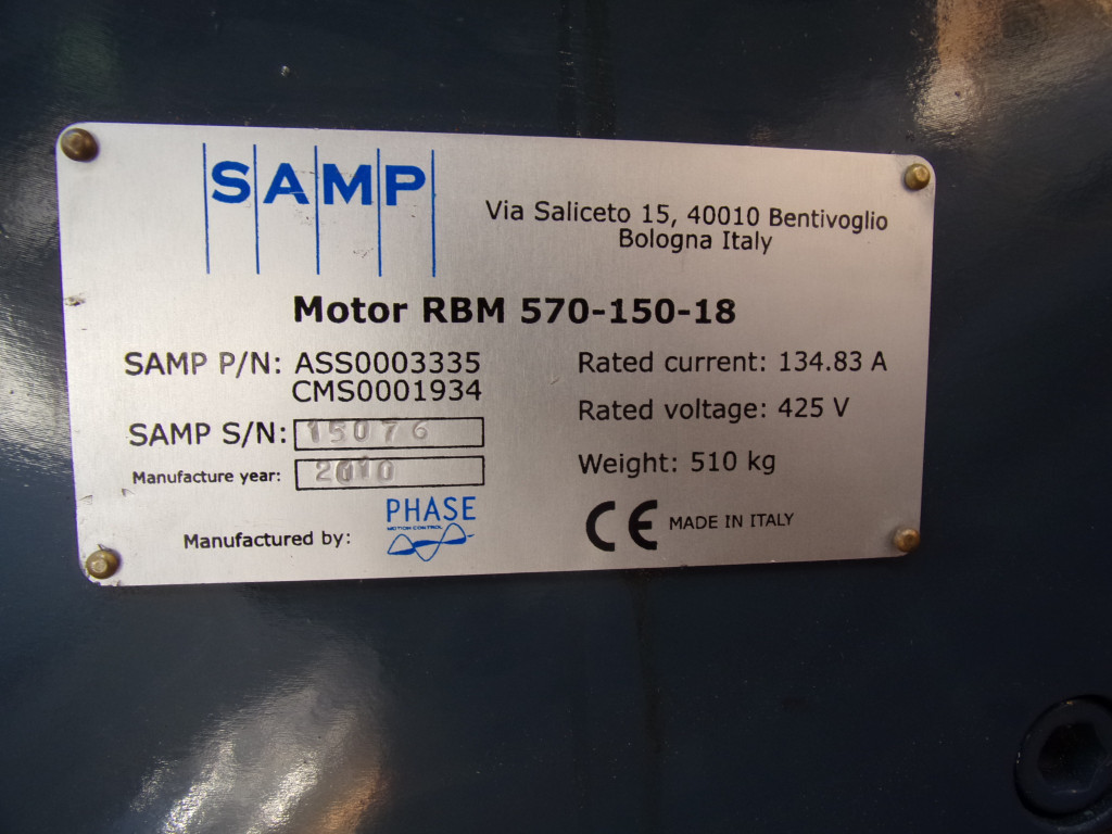 Samp / Phase RBM 570-150-18, TK 570.150.18.A1, 64 pólusú PMSM állandómágneses villanymotor, 425 V, 134,83 A, 67,25 kW, 180 Nm/A, 288 rpm, TK sorozat, egyedi gyártású vízhűtéses nyomatékmotor