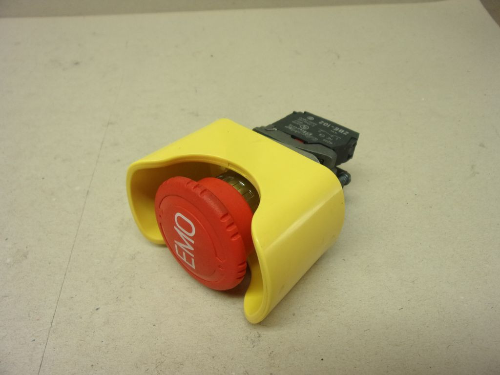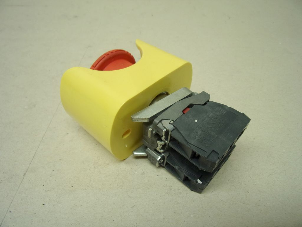 Telemecanique (Schneider Electric) piros vészleállító nyomógomb, sárga védőkerettel, ZB4BZ009 gallérral + 2x ZBE-102 NC érintkező modullal, 22mm furatba,