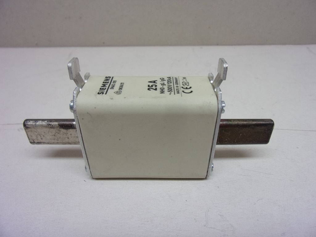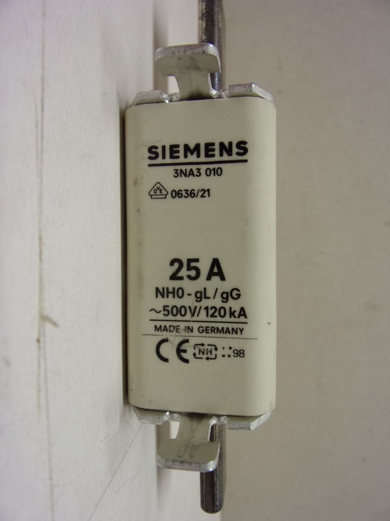 Siemens 3NA3010, Késes biztosíték, 25A 500VAC 440VDC, 120kA, NH0, gL/gG, biztosító betét, első indikátorral,