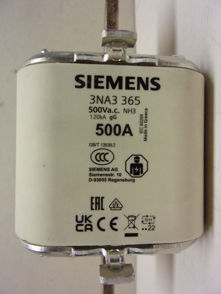 Siemens 3NA3365, Késes biztosíték, 500A 500VAC 440VDC, 120kA, gG, NH3, biztosító betét, első indikátorral,