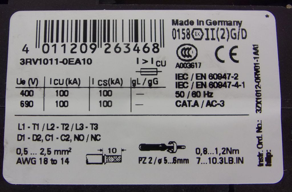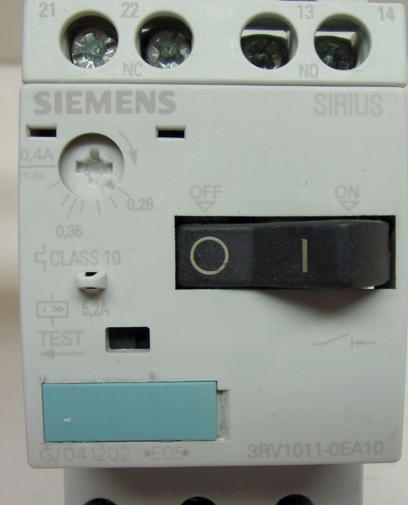 Siemens Sirius 3RV1011-0EA10, 3 fázisú hőkioldó, 0,28-0,4 A, motorvédő kapcsoló, 0,1kW, 400V, 1 NO+1 NC, csavaros bekötés, S00 méretű megszakító motorvédelemhez,