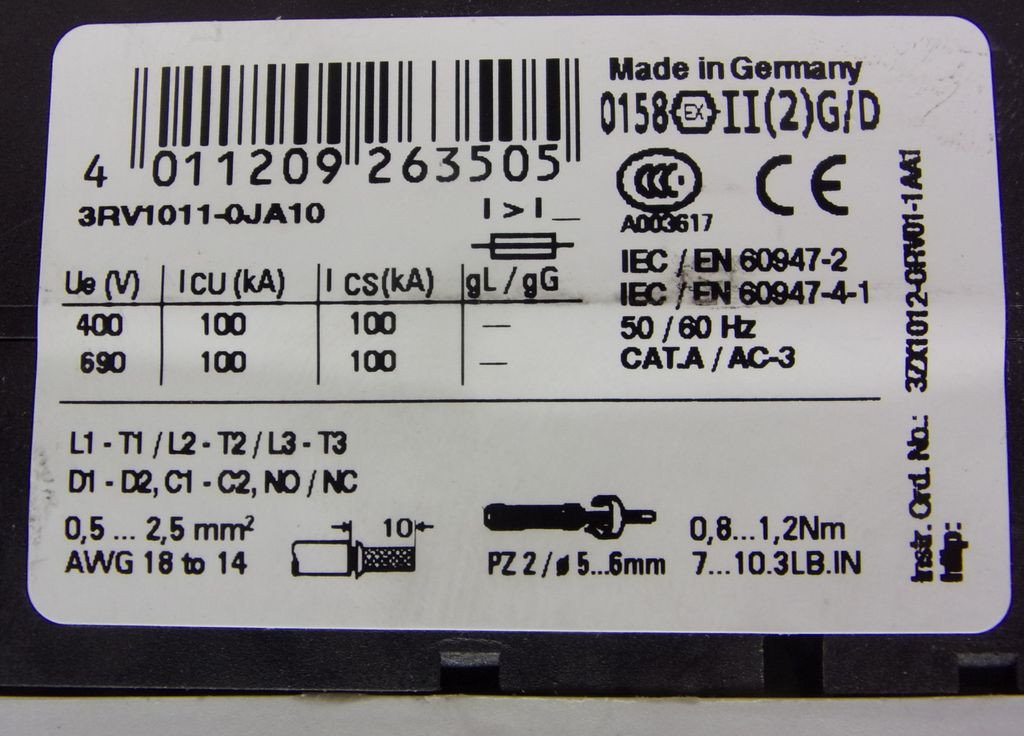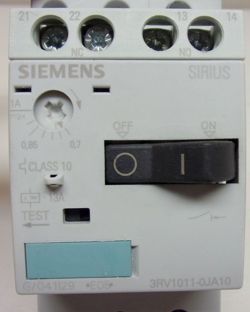 Siemens Sirius 3RV1011-0JA10, 3 fázisú hőkioldó, 0,7-1 A, motorvédő kapcsoló, 0,25kW, 400V, 1 NO+1 NC, csavaros bekötés, S00 méretű megszakító motorvédelemhez,