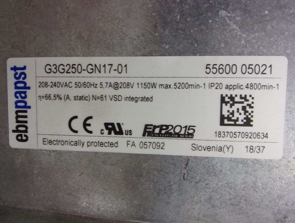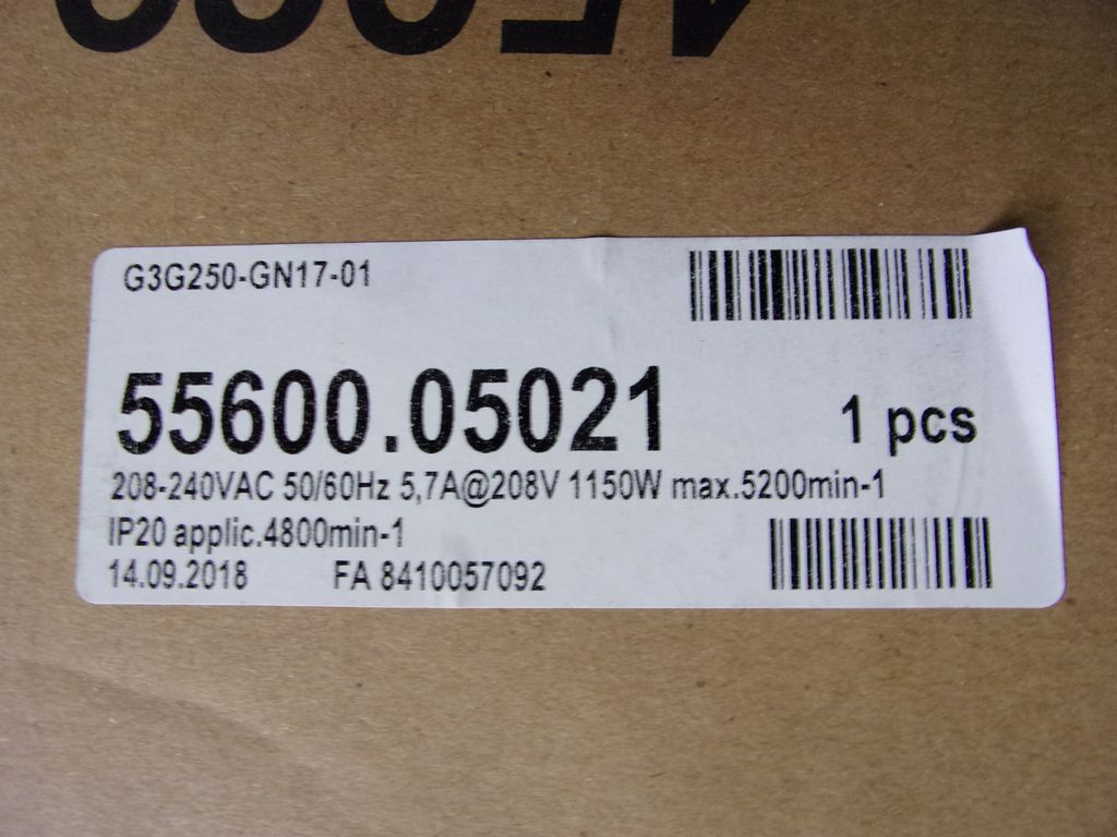 Motor: 1~ 208-240VAC 50/60Hz, 5,7A (208V), 1150W, 4800-5200rpm