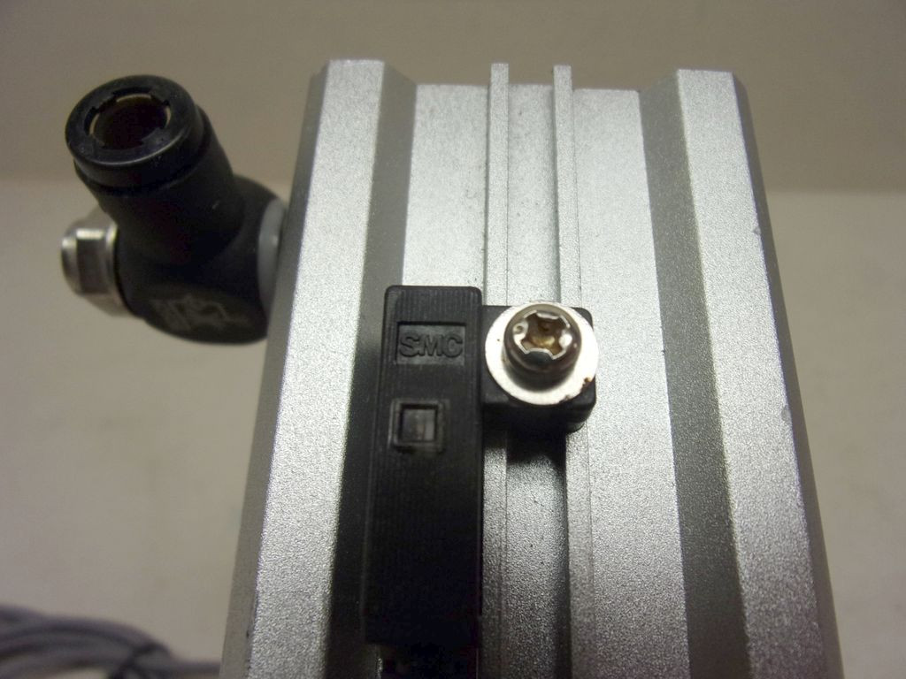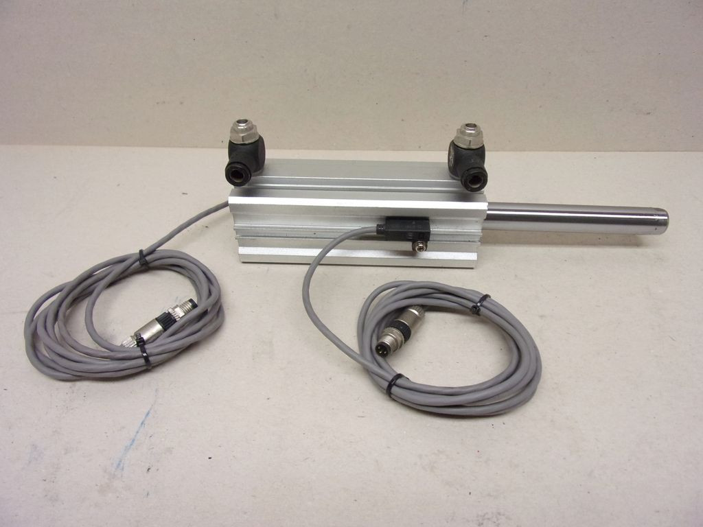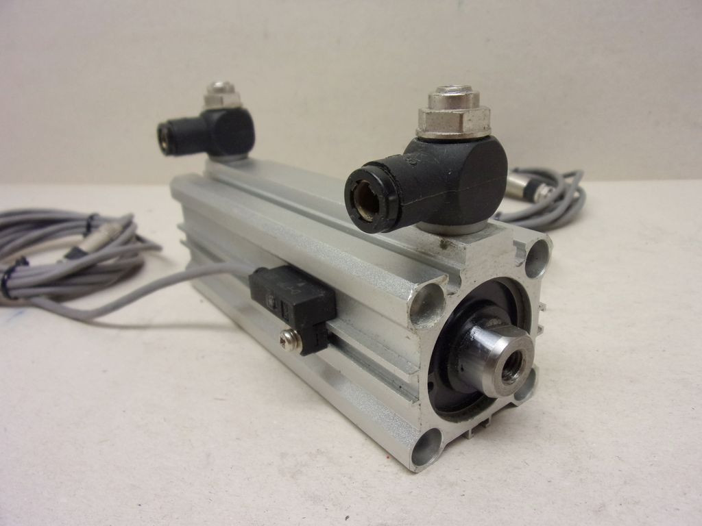 SMC ECDQ2B32-100D kettős működésű, kompakt peumatikus munkahenger, dugattyú Ø 32mm, lökethossz 100mm, 2x SMC D-F7P szezorral, 2x Bosch R412010588 áramlásszabályozó szeleppel, M8 3 pin csatlakozókkal